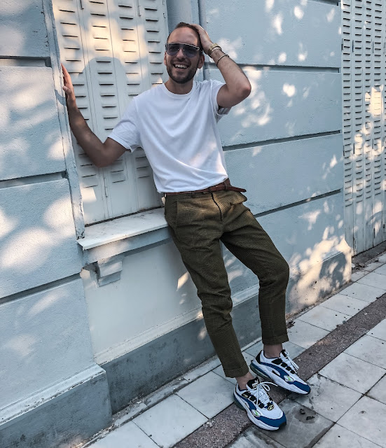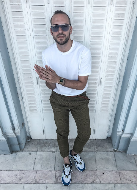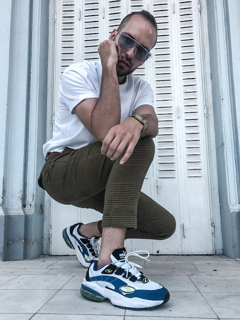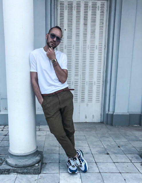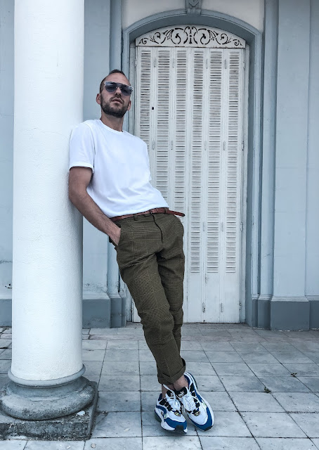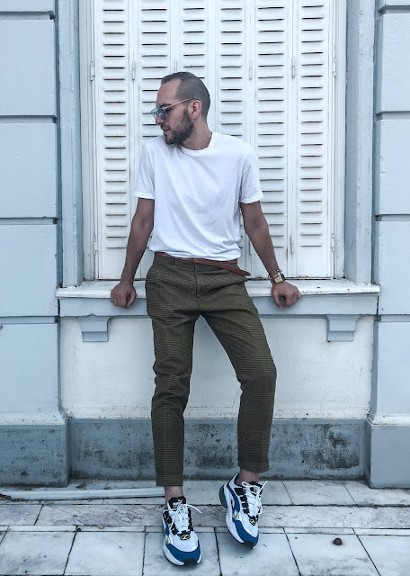 The shoes’ look is divisive, because they are rather different from the slim, elegant styles some are used to wear. They may look ´´ugly´´, but designers and sportswear brands have studied well the shoes’ performance. Most of the times ´´dad sneakers´´ feature a double or triple sole, making you look a little taller, quite a bonus, and help walking smoothly without affecting too much the back or the legs. Another divisive element is the décor: curvy lines in bright hues or neon colors. Rather flashy shoes for those used to all white or all black styles. The dad sneakers for 2018/19 take us back to about 20 years ago when trainers had a cartoon like design that imitated the look of videogames characters. In other words, the final effect is more sporty that chic. I love this new style for 21. century, freedom as well as a combination of different styles, playing with fashion. I´m delighted with these big sneakers, because they fit in with everything. For work with jeans or trousers, fantastic for traveling because they are very comfortable, as well as something more elegant with the classic suit but also for night out. For this post, I decided to wear plaid pants, which are my designs, green and black, classic white T-shirt, brown belt, blue sunglasses, gold jewellery, and this beautiful and my favorite sneakers for summer. This is casual style, modern casual style. I really hope you like this post, follow my blog, I also welcome your comments and hope you enjoy it all. 🙂