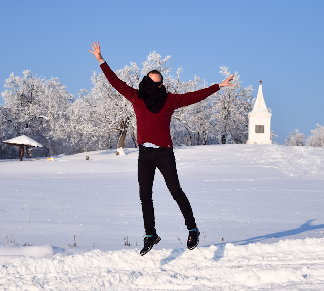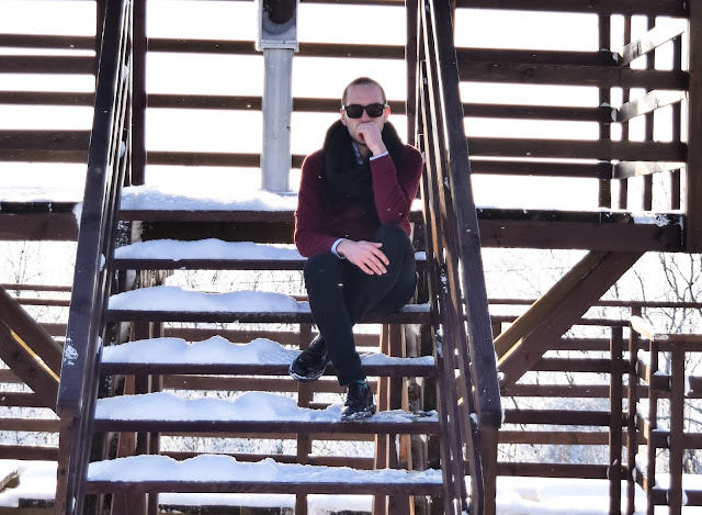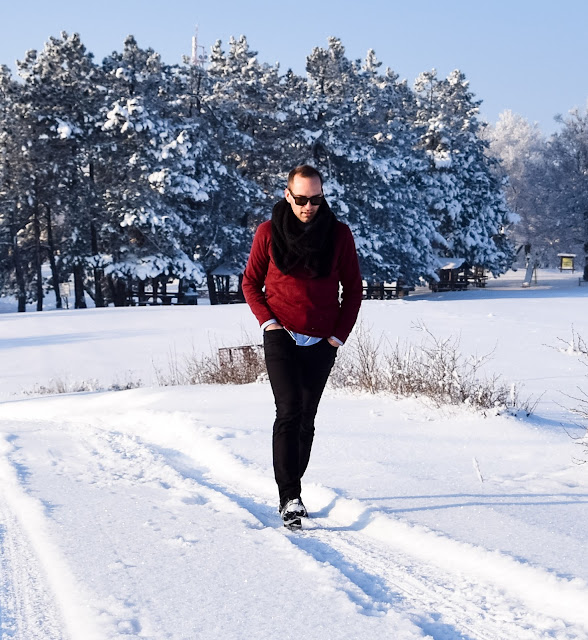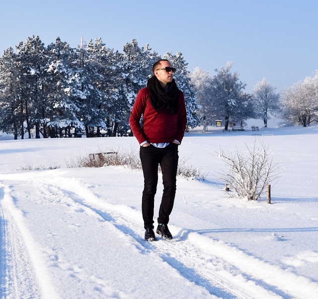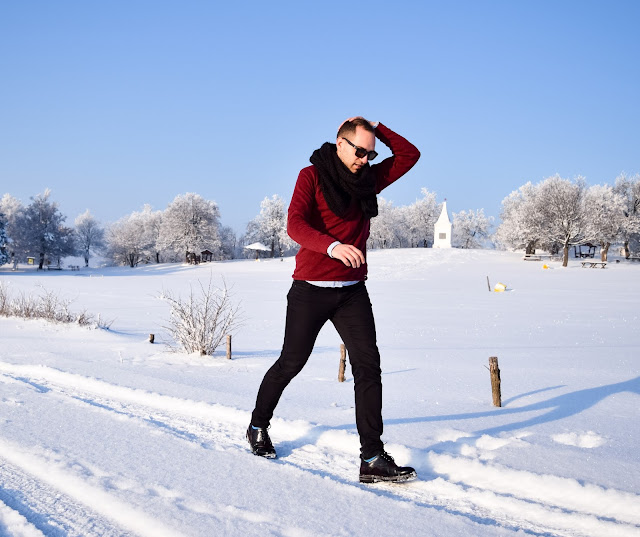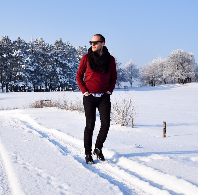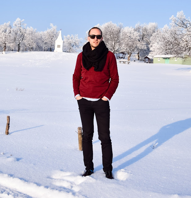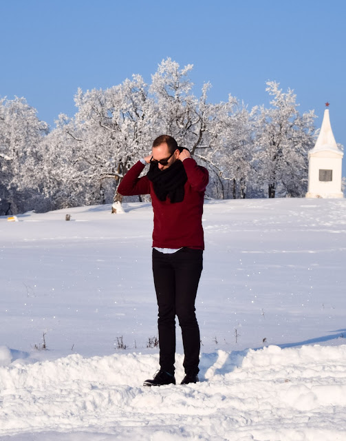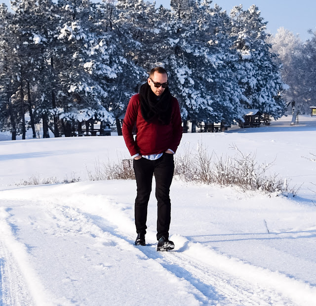 Hello friends, I want to introduce to you the new photos and a new outfit. Darker combination predominant black color, one of my favorites. I decided to shoes that you already saw in one of the first posts, (name post : Italian shoes), patent are very comfortable and elegant, tight jeans, black, I think that´s excellent to combine, you can wear them with any sweater, shirt, sport shirt, T-shirt, it would look good because they go with everything. Burgundy sweater is not thick, very comfortable, in this combination under him wearing the shirt lighter tones, in order to break the monotony of dark colors, very often I wear this sweater with nothing underneath as it is very comfortable and soft, a black woolen scarf it is about 2 metars long, it s very warn and very dark glasses, nice protect from the sun and from the snow whiteness. I think you have to every piece of clothing and every part of the shoes in black, so the lasiest way is combine with the other stuff in warious colors or even colorful clothes, it is ideal when you stare somewhere and you do not have time to experiment with things or when you do not have enough inspiration. These photos were made on the mountain near the town where I live, I hope you like those images and to respect my advice, enjoy:)
